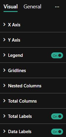 The Nested Total Chart provides extensive formatting capabilities accessible through the ‘Format Visual’ pane, enabling comprehensive customization beyond the standard General formatting options available to all Power BI visuals.