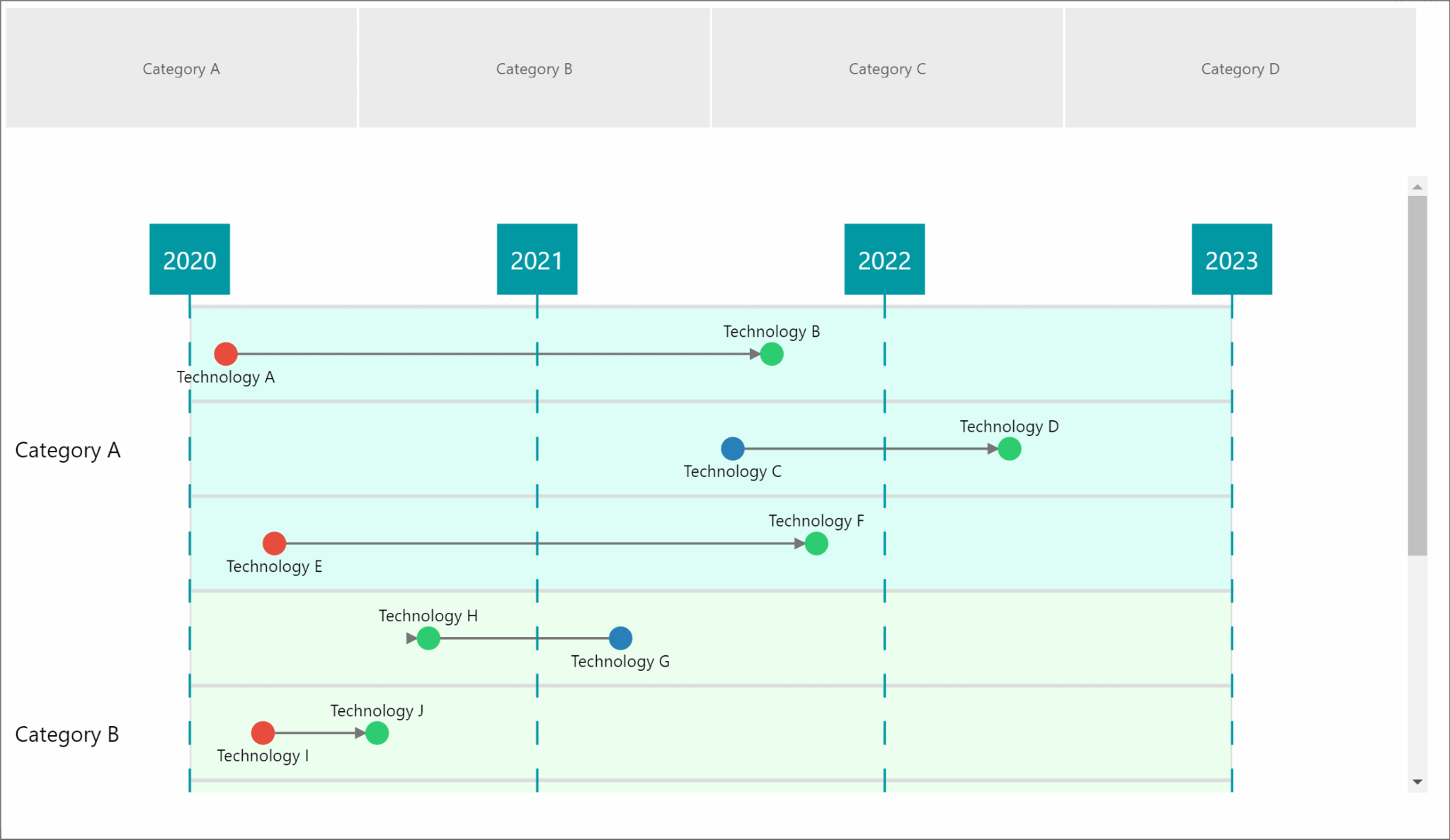 A timeline visual that shows the successor node and predecessor nodes of various tasks with dates for each node. The nodes were also categorized inside containers based on a category field. The visual has functionalities like: