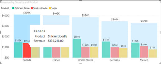 The visual supports both standard Power BI tooltips (displaying field values) and enhanced tooltip pages (custom report pages displayed on hover). Tooltips provide additional context without cluttering the main visualization, supporting detailed data exploration.