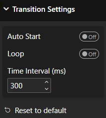- Transition Controls: Auto-start begins playback on load; loop repeats indefinitely; time interval (ms) sets speed (default 1000ms).